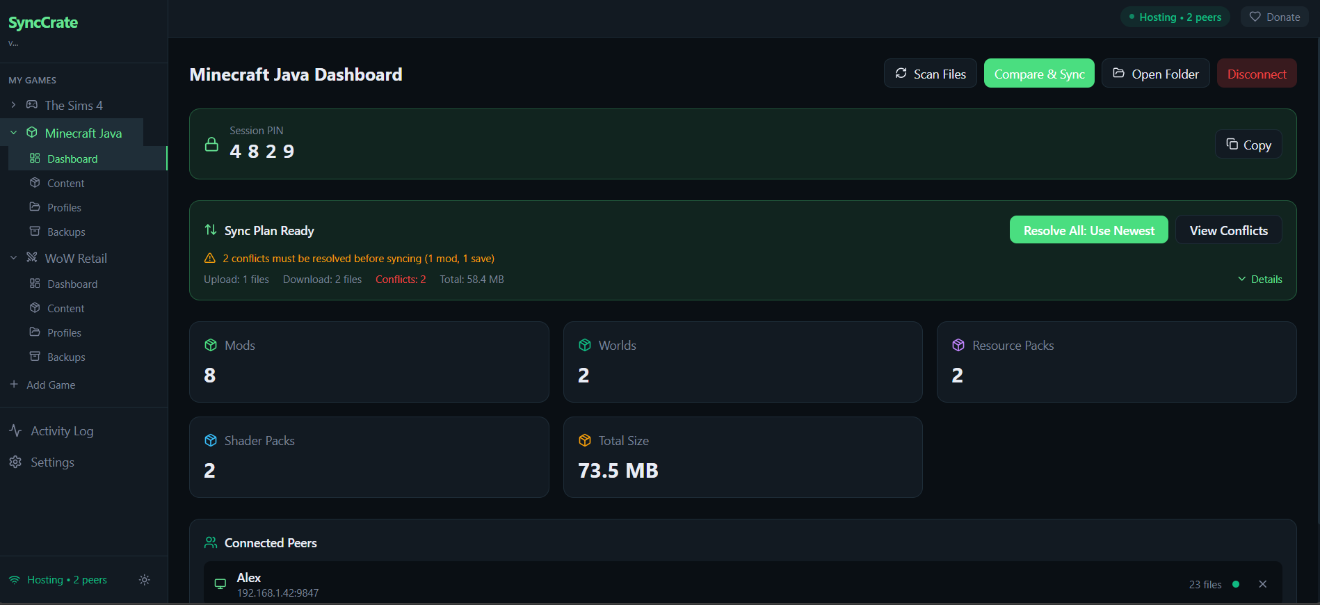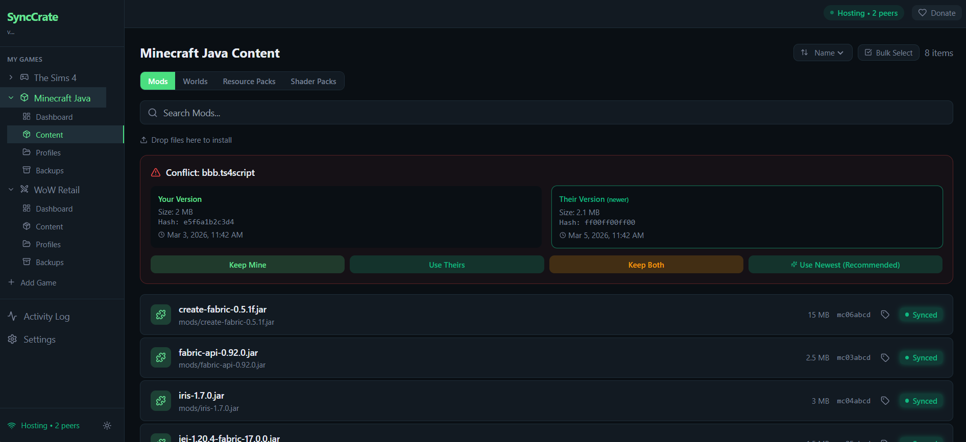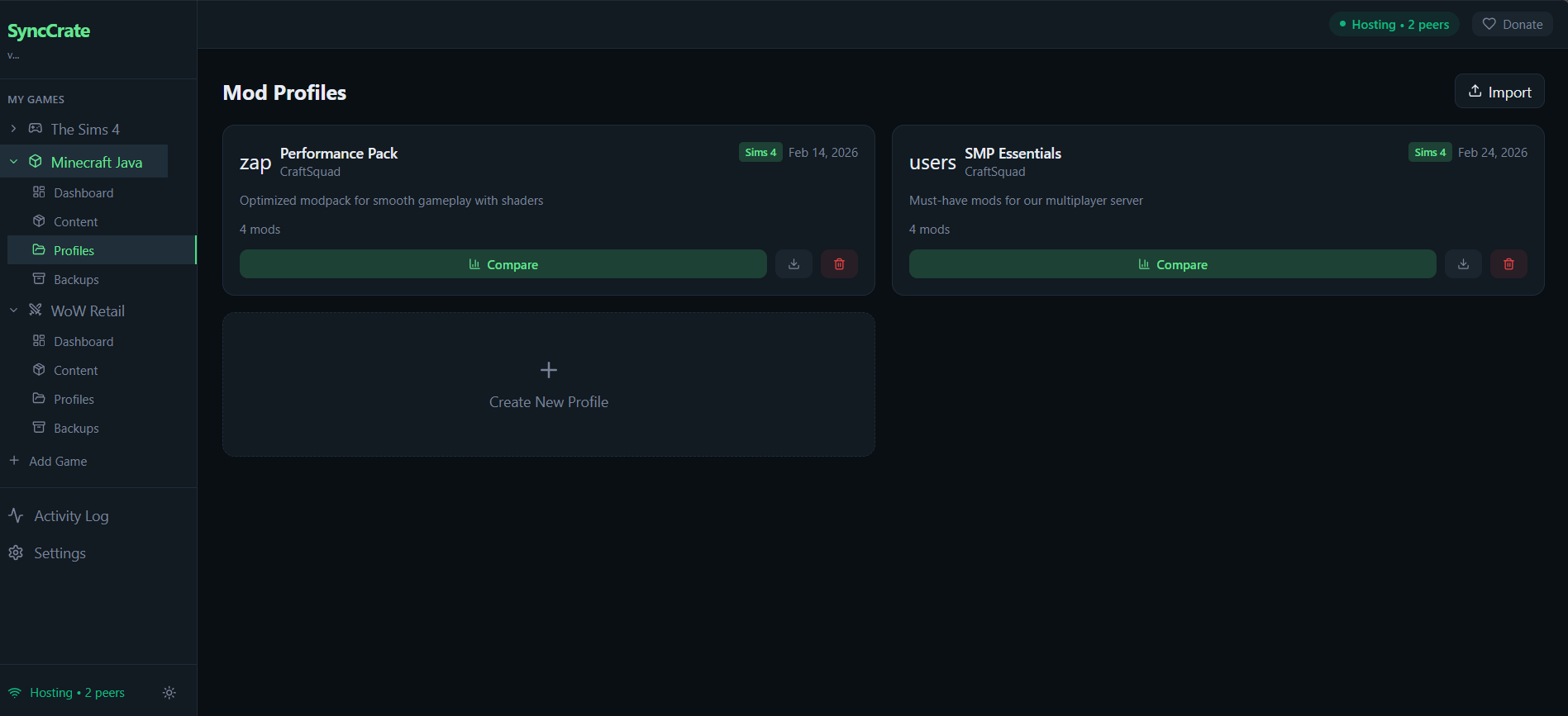 Snapshot your mod setup, export as a .synccrate-profile file, share on Discord. Friends drag it in and they're set.
